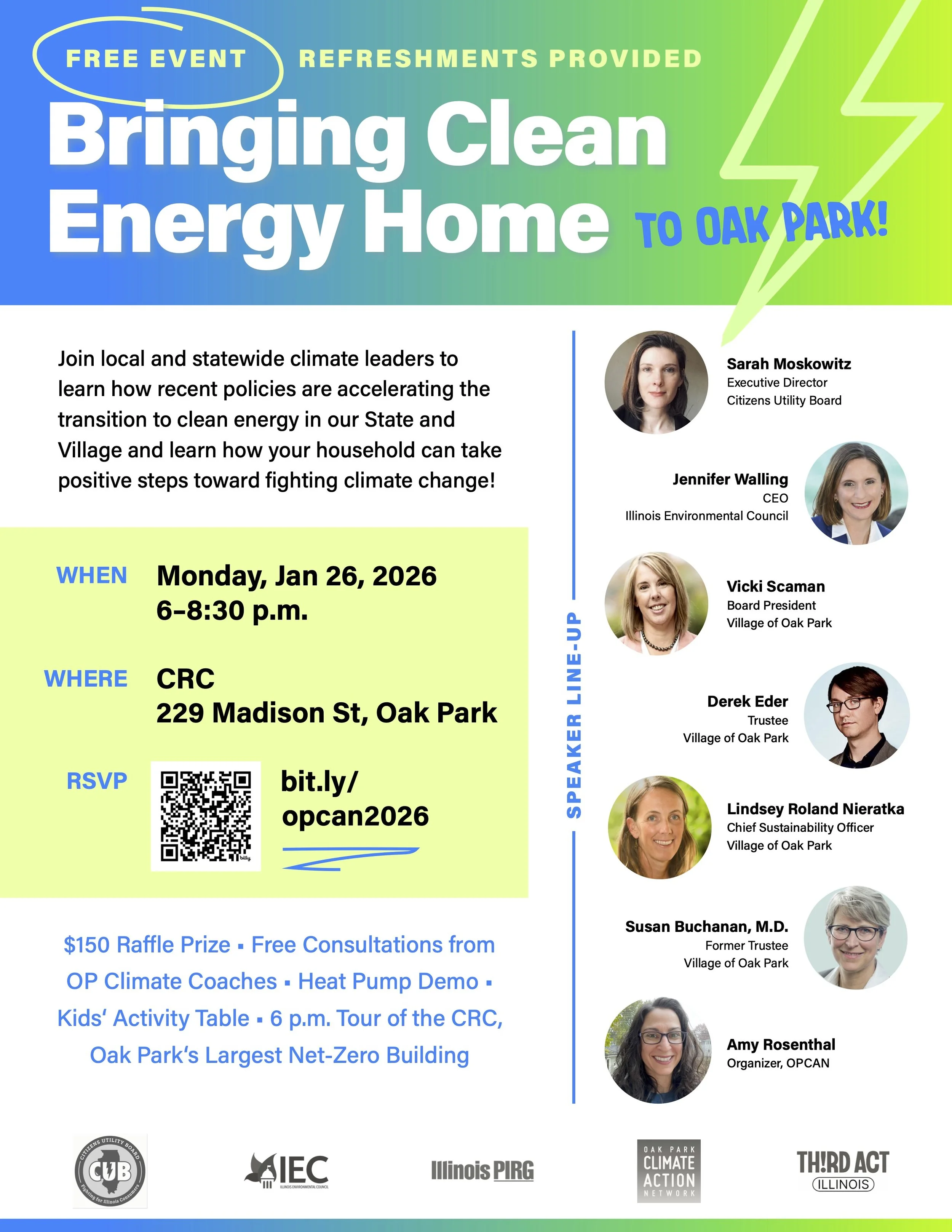 This free event is in partnership with Oak Park Climate Action Network, Citizens Utility Board (CUB), Illinois Environmental Council, Illinois Public Interest Research Group (PIRG), and Third Act Illinois.